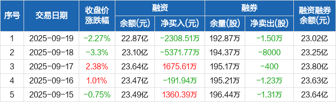 第一创业:融资净偿还2308.51万元,融资余额22.87亿元(09-19)