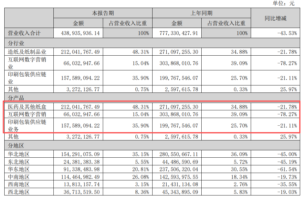 2025年上半年,环球印务三大核心板块的营业收入同比皆出现下降。其中,互联网数字营销业务的营业收入约为6603.29万元,相较于去年同期,降幅高达78.27%!而医药及其他纸盒和印刷包装供应链业务同比降幅都超过20%。