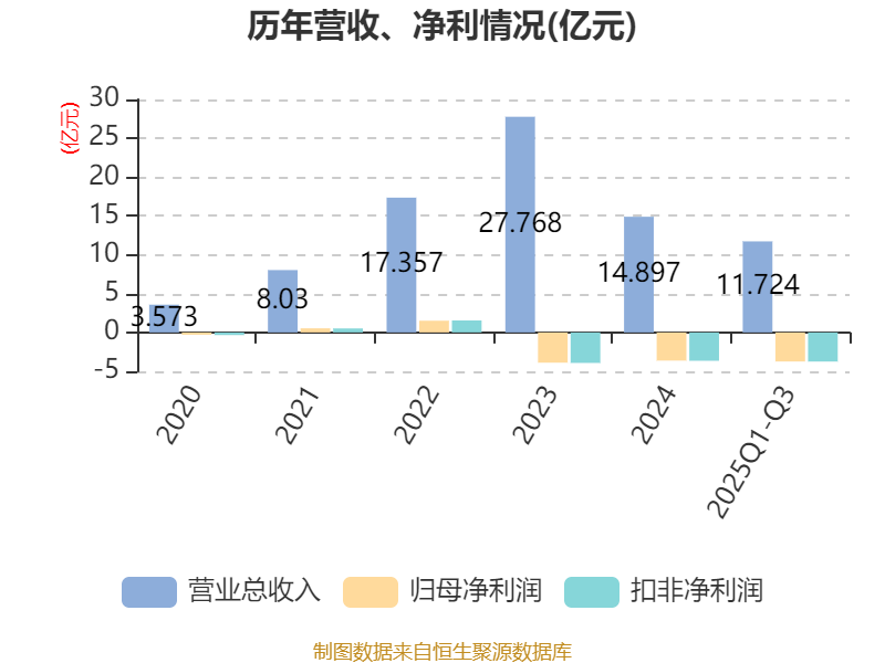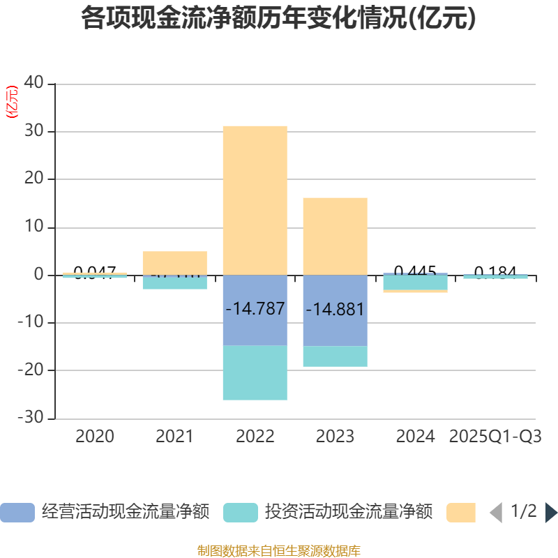 2025年前三季度,公司经营活动现金流净额为1844.78万元,同比增长1097.17%;筹资活动现金流净额-89.65万元,同比增加2.13亿元;投资活动现金流净额-7645.06万元,上年同期为-1.49亿元。