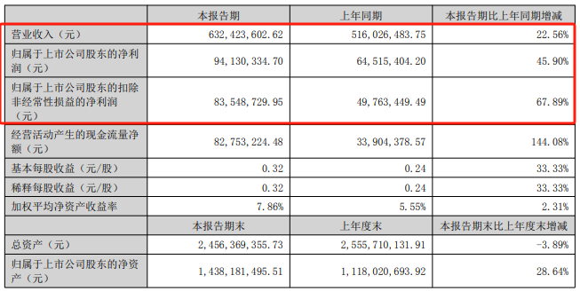2025年上半年,公司营业收入为6.32亿元,同比增长22.56%;归母净利润为9413.03万元,同比增长45.90%;扣非归母净利润为8354.87万元,同比增长67.89%。