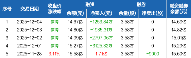 融资方面,当日融资买入0元,融资偿还1253.84万元,融资净偿还1253.84万元,连续4日净偿还累计9112.42万元。融券方面,融券卖出0股,融券偿还0股,融券余量3.58万股,融券余额198.15万元。融资融券余额合计14.69亿元。