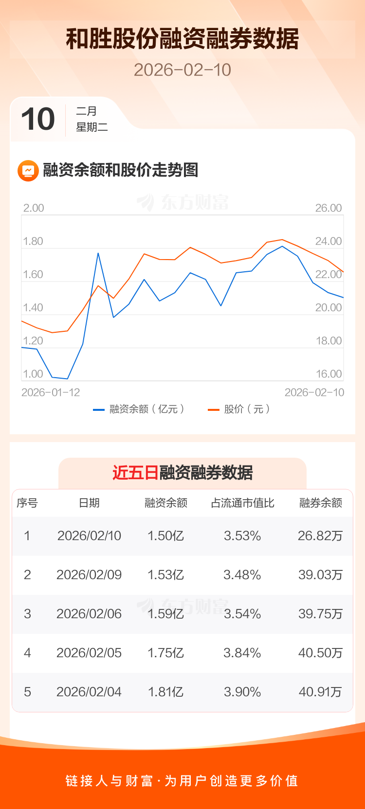 交易所最新数据显示,和胜股份于2026年2月10日获融资买入1608.27万元,融资偿还1849.07万元,当日融资净偿还240.79万元。目前,该股融资余额1.50亿,占流通市值比例为3.53%。