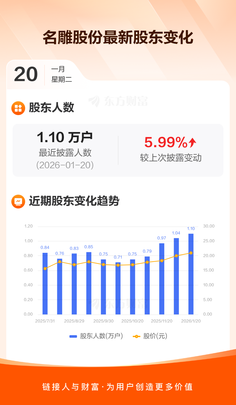 名雕股份最新披露数据显示,截至1月20日公司股东户数为1.10万户,较上期(2026年1月9日)增加623户,增幅为5.99%。户均持有流通股数量由上期的6430股下降至6067股,户均持股金额由上期的12.85万元减少至12.70万元。