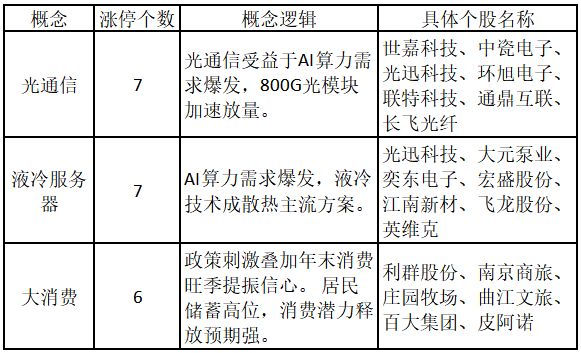 从概念特征来看,今日涨停板个股中,光通信、液冷服务器、大消费概念的个股最多。