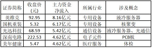 从主力资金来看,今日涨停板个股中,主力资金净流入金额排名前5的个股分别为英维克、国机重装、光迅科技、深南电路、美年健康。