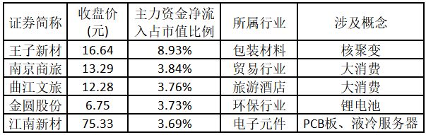 主力资金净流入金额占市值比例排名前5的个股分别为王子新材、南京商旅、曲江文旅、金圆股份、江南新材。