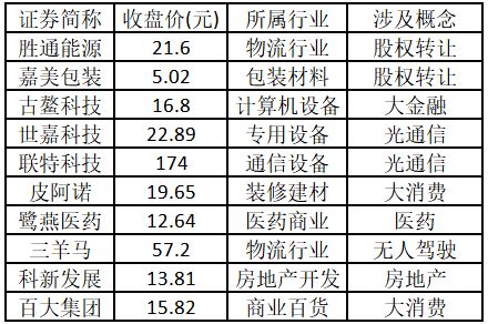 涨停板个股中,股价创出近一年新高的个股有10只(不包括创出历史新高的个股),包括胜通能源、嘉美包装、古鳌科技、世嘉科技、联特科技、皮阿诺、鹭燕医药、三羊马、科新发展、百大集团,具体如下表所示。