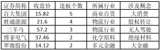 从连板情况来看,今日首板个股有41只;2连板的个股有5只;3连板及以上的个股有3只。今日连板数排名前5的个股包括百大集团、胜通能源、三羊马、博菲电气、翠微股份,具体如下表所示。