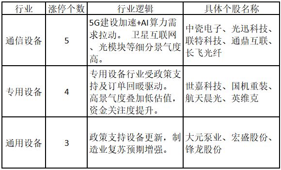 从行业特征来看,今日涨停板个股中,通信设备、专用设备、通用设备行业的个股最多。