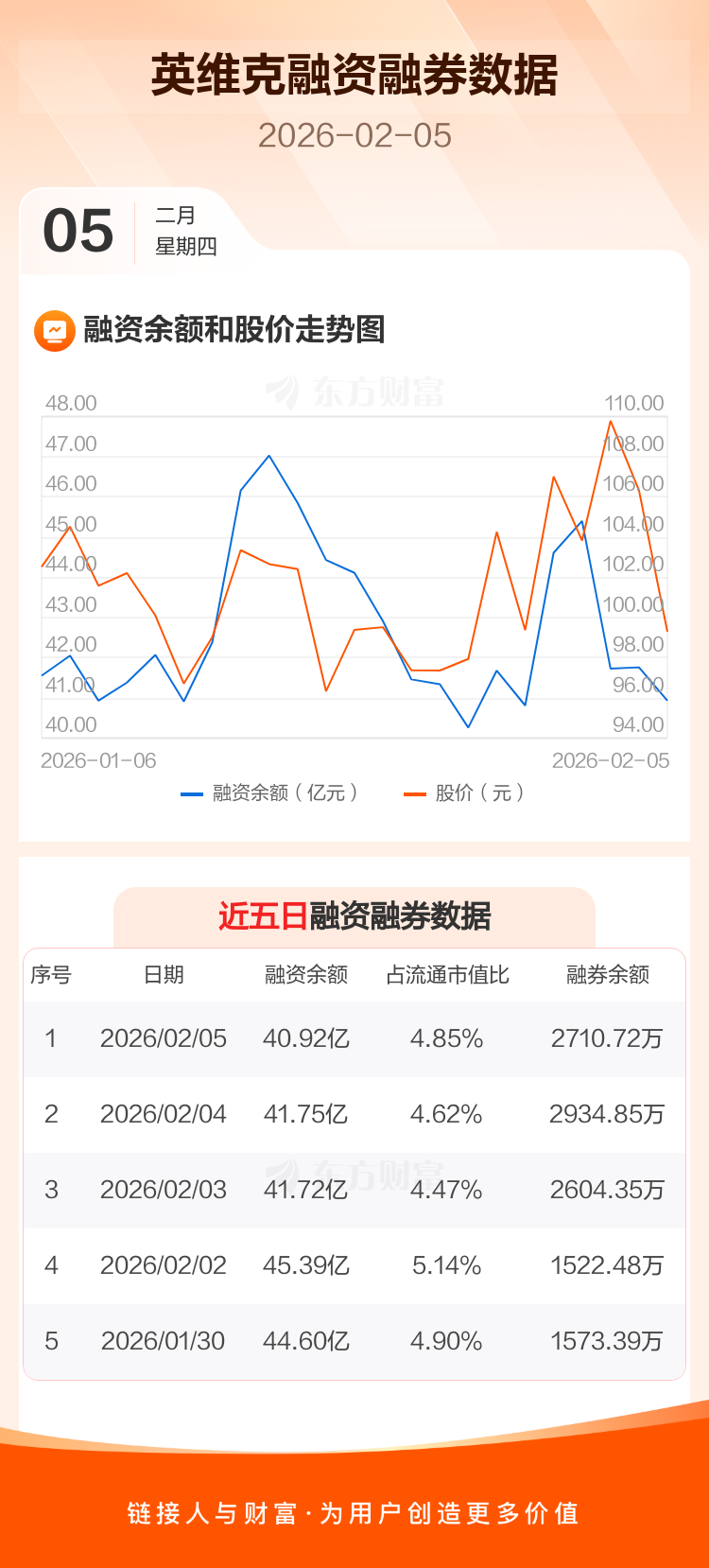 交易所最新数据显示,英维克于2026年2月5日获融资买入4.45亿元,融资偿还5.28亿元,当日融资净偿还8377.54万元。目前,该股融资余额40.92亿,占流通市值比例为4.85%。