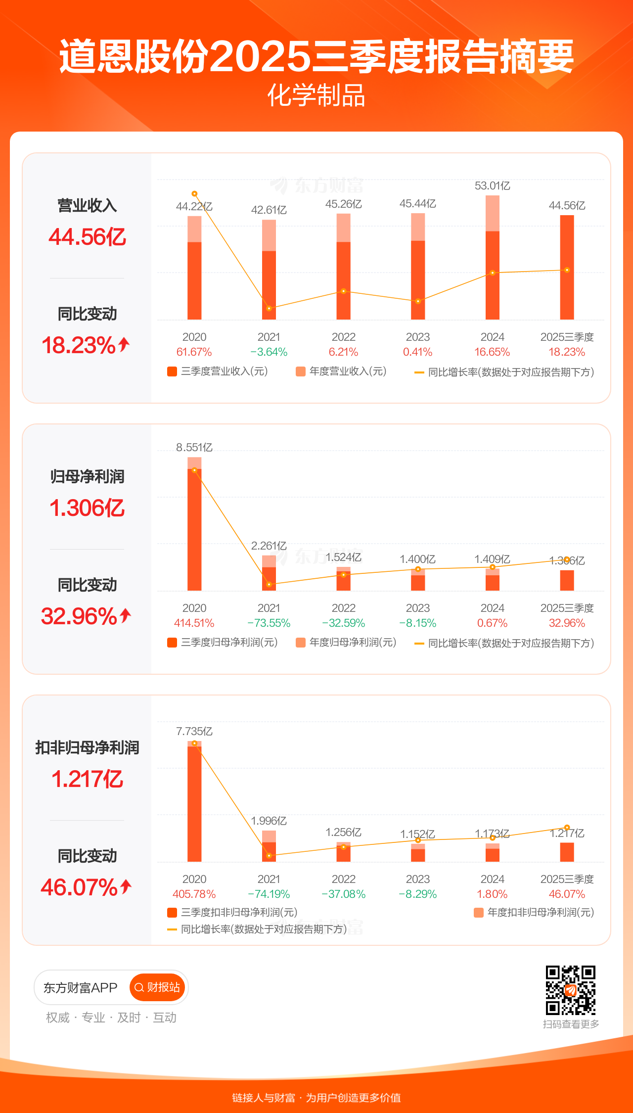 道恩股份10月24日发布2025年三季报显示,公司前三季实现营业收入44.56亿元,同比增长18.23%;归母净利润1.31亿元,同比增长32.96%;扣非归母净利润1.22亿元,同比增长46.07%。