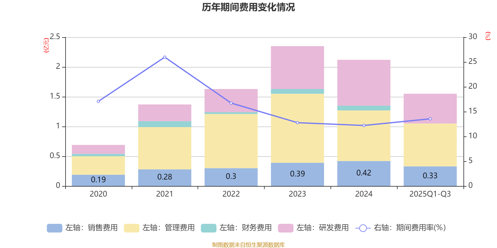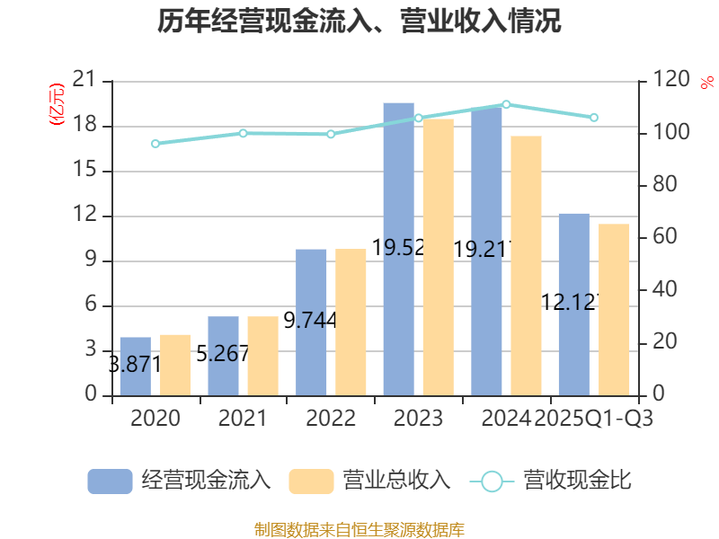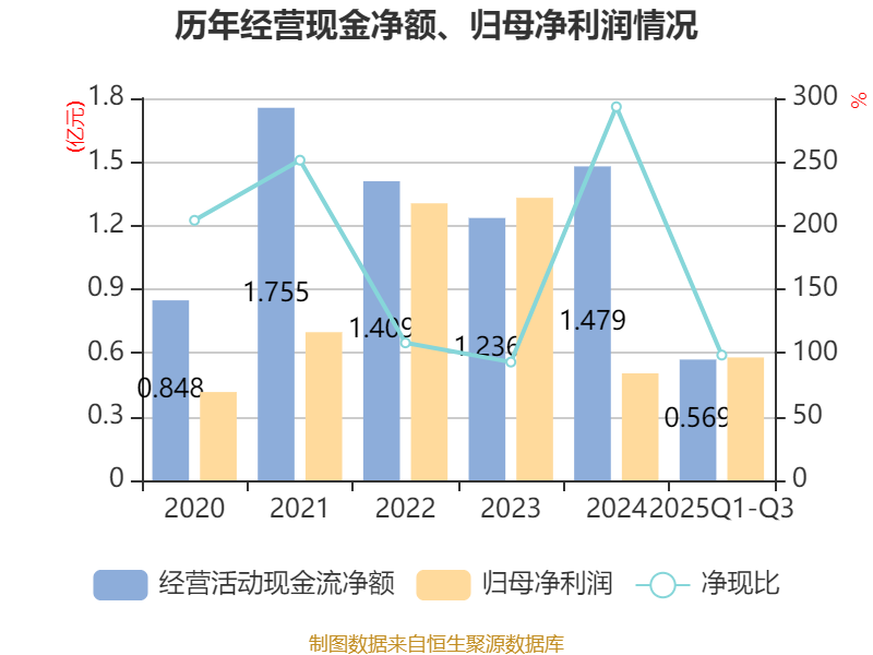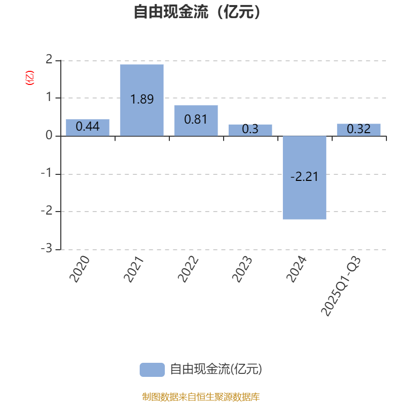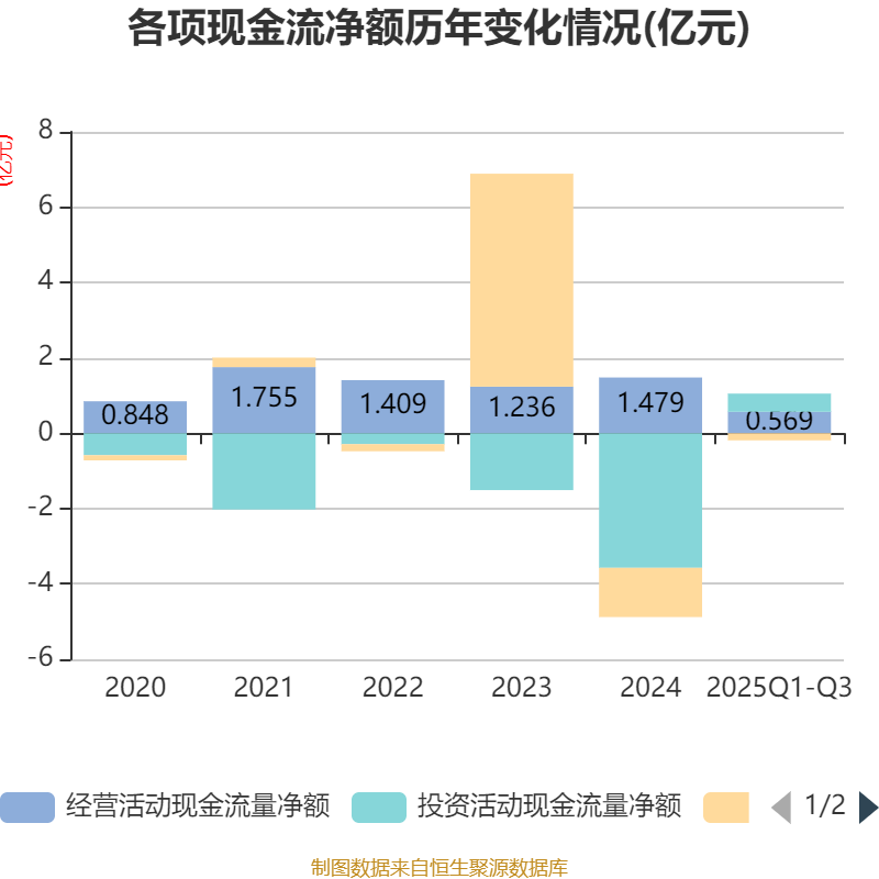 2025年前三季度,公司经营活动现金流净额为5693.83万元,同比下降36.5%;筹资活动现金流净额-1890.94万元,同比增加9312.53万元;投资活动现金流净额4830.02万元,上年同期为-3.2亿元。