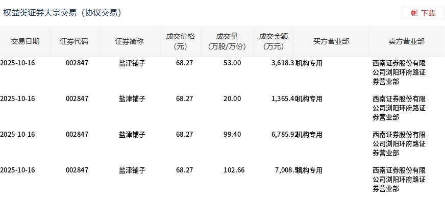 10月16日,盐津铺子大宗交易成交275.06万股,成交额1.88亿元,占当日总成交额的43.99%,成交价68.27元,较市场收盘价73.41元折价7%。