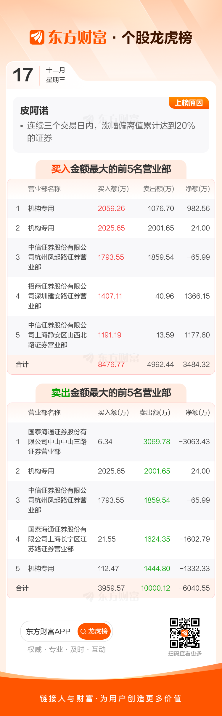 皮阿诺(002853)龙虎榜数据(12-17)