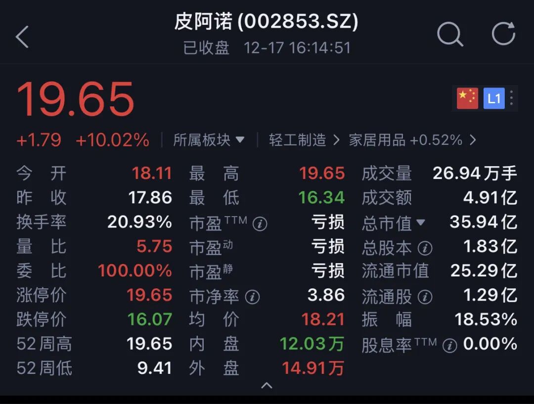 12月17日,皮阿诺以18.11元的价格高开,随后震荡走高,午盘后封住涨停板,报19.65元。算上前一日交易日(12月16日),复盘后的两天时间里,皮阿诺股价上涨了21%。
