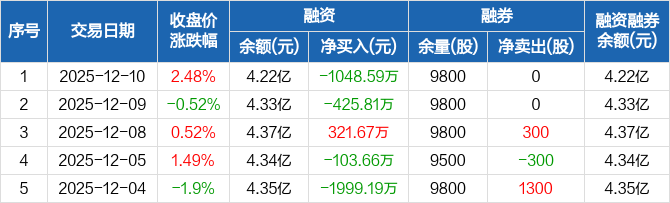 钧达股份:融资净偿还1048.59万元,融资余额4.22亿元(12-10)