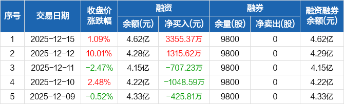 融资方面,当日融资买入2.15亿元,融资偿还1.81亿元,融资净买入3355.37万元。融券方面,融券卖出0股,融券偿还0股,融券余量9800股,融券余额39.95万元。融资融券余额合计4.62亿元。