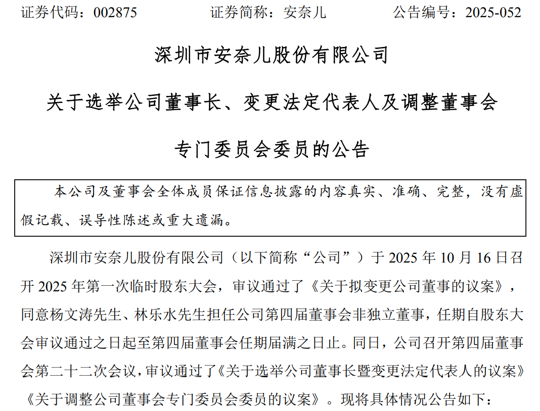 10月16日晚间,国内知名童装企业安奈儿(002875)公告,公司董事会同意选举杨文涛担任公司第四届董事会董事长,任期自董事会审议通过之日起至第四届董事会任期届满之日止。