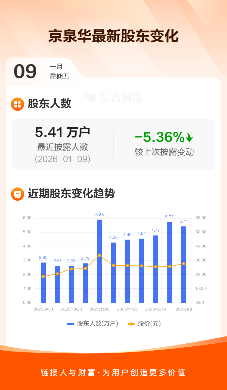 京泉华:截至1月9日最新股东户数5.41万户,较上期减少5.36%
