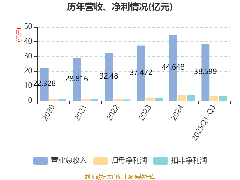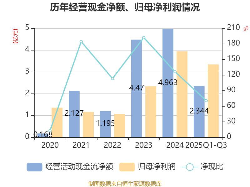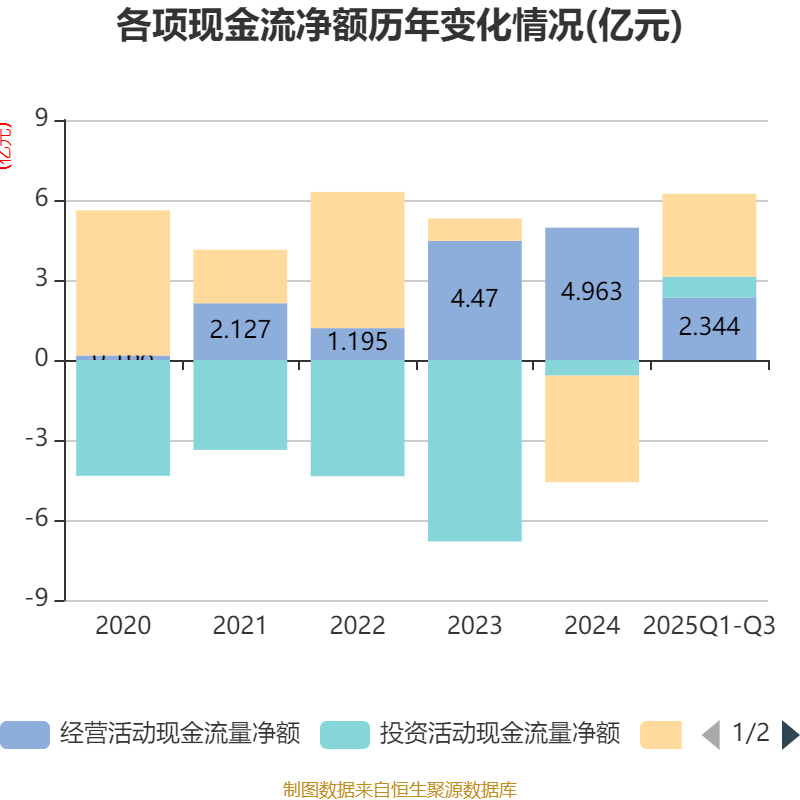 2025年前三季度,公司经营活动现金流净额为2.34亿元,同比增长18.24%;筹资活动现金流净额3.11亿元,同比增加6.34亿元;投资活动现金流净额7816.87万元,上年同期为6360.34万元。