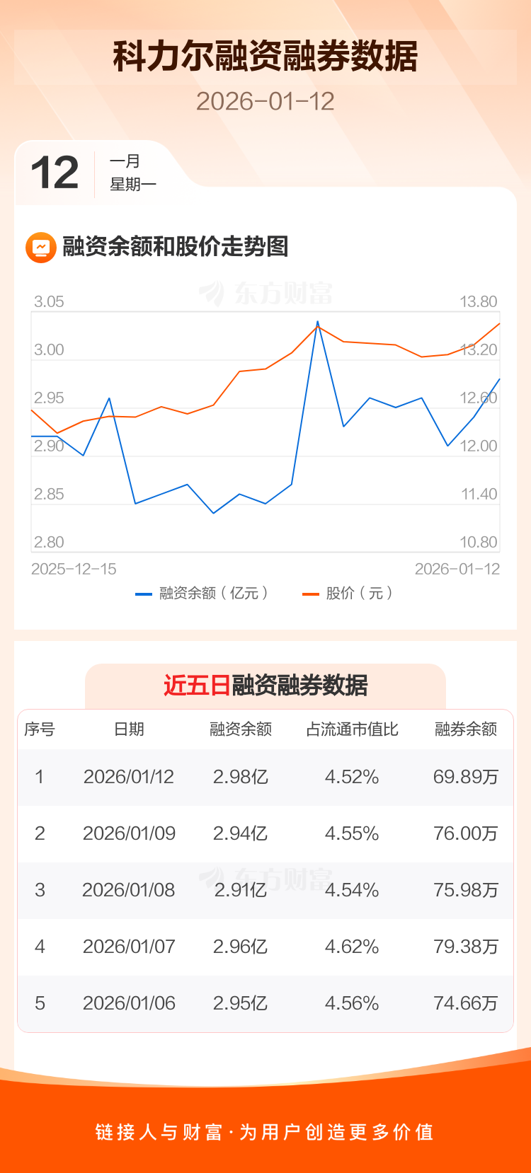 交易所最新数据显示,科力尔于2026年1月12日获融资买入3104.75万元,融资偿还2673.57万元,当日融资净买入431.18万元。目前,该股融资余额2.98亿,占流通市值比例为4.52%。
