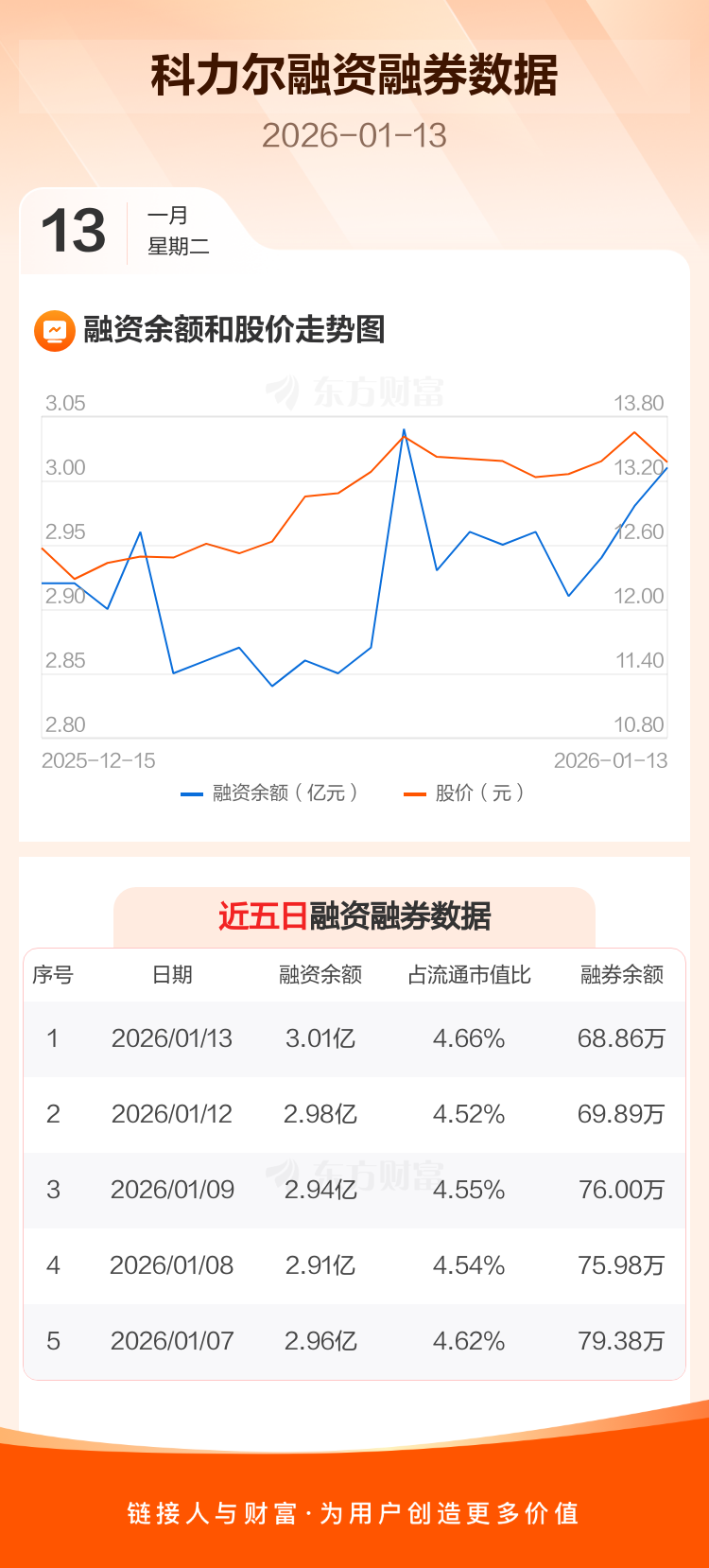 交易所最新数据显示,科力尔于2026年1月13日获融资买入2633.53万元,融资偿还2339.48万元,当日融资净买入294.04万元。目前,该股融资余额3.01亿,占流通市值比例为4.66%。