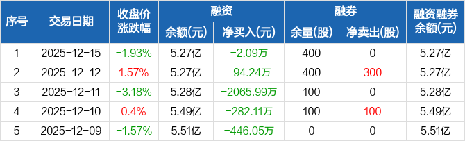 融资方面,当日融资买入2059.67万元,融资偿还2061.76万元,融资净偿还2.09万元,连续6日净偿还累计4030.13万元。融券方面,融券卖出0股,融券偿还0股,融券余量400股,融券余额3.27万元。融资融券余额合计5.27亿元。