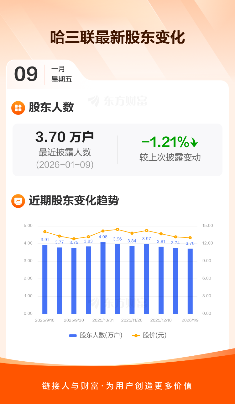 哈三联:截至1月9日最新股东户数3.70万户,较上期减少1.21%