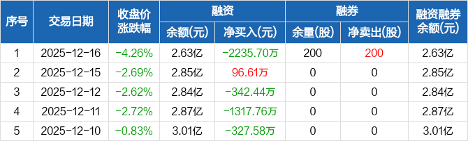 宇环数控:融资净偿还2235.7万元,融资余额2.63亿元(12-16)