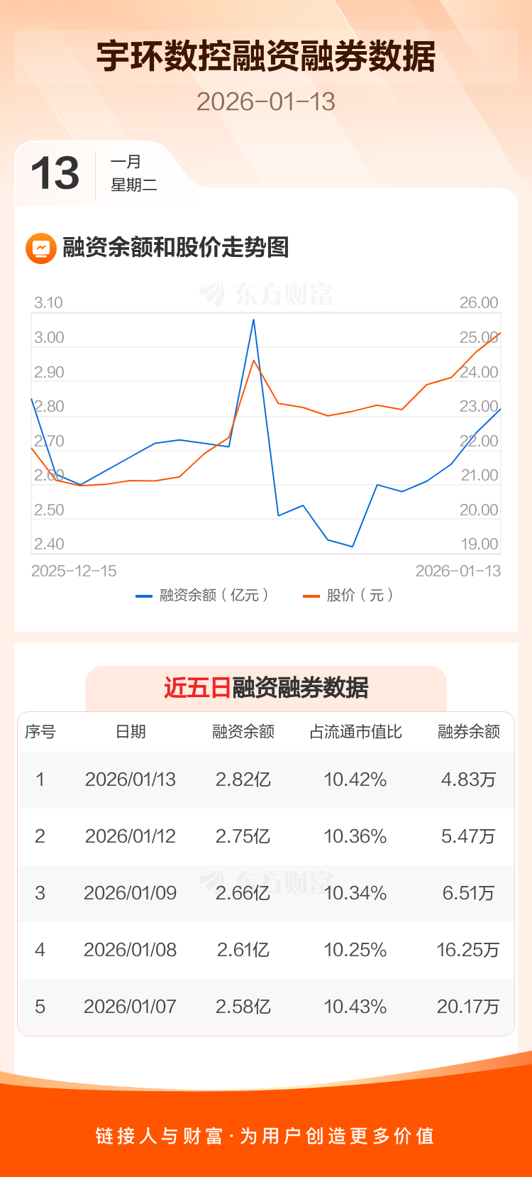 交易所最新数据显示,宇环数控于2026年1月13日获融资买入5553.69万元,融资偿还4773.58万元,当日融资净买入780.11万元。目前,该股融资余额2.82亿,占流通市值比例为10.42%。