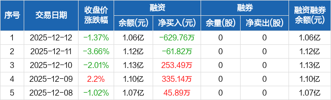 集泰股份:融资净偿还629.76万元,融资余额1.06亿元(12-12)