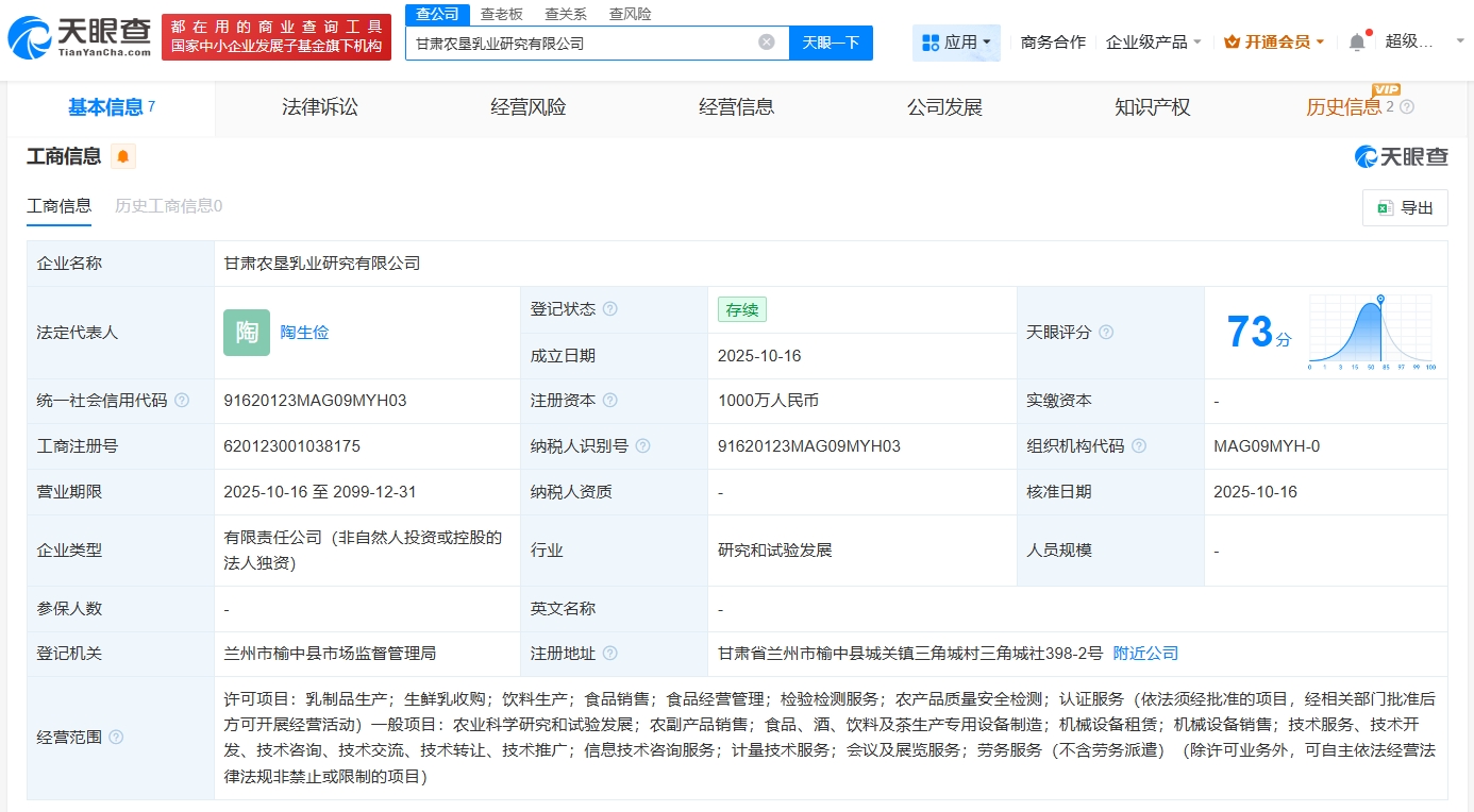 南方财经10月21日电,天眼查App显示,近日,甘肃农垦乳业研究有限公司成立,法定代表人为陶生俭,注册资本1000万人民币,经营范围包括乳制品生产、生鲜乳收购、饮料生产、食品销售、食品经营管理等。股东信息显示,该公司由庄园牧场(002910)全资持股。
