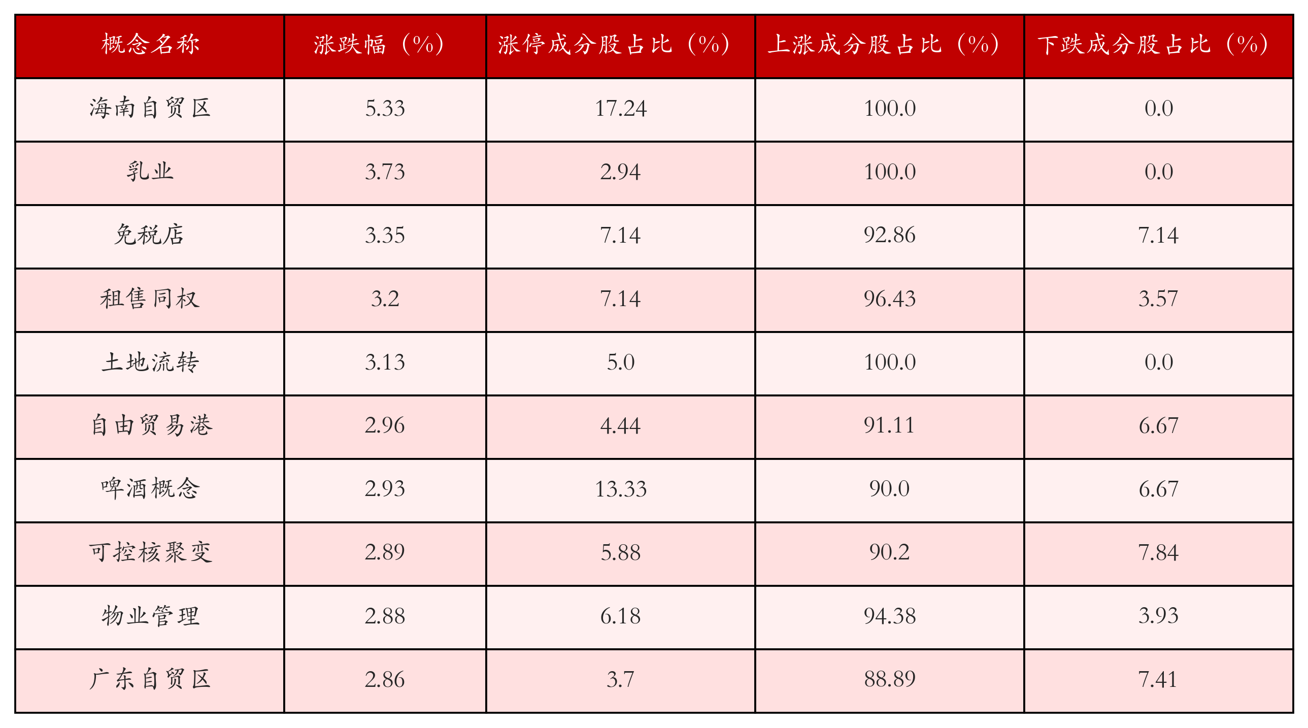 根据A股概念涨跌幅与所对应的股票池综合分析,涨幅靠前的三个概念板块分别为:海南自贸区、乳业与免税店。排名前10位的概念板块相关数据见下表: