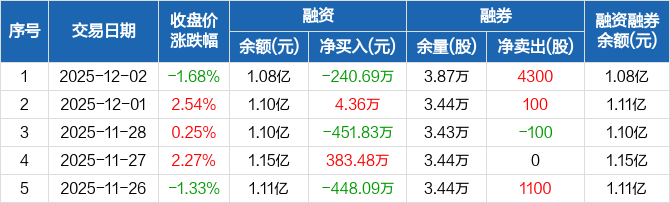 融资方面,当日融资买入414.2万元,融资偿还654.89万元,融资净偿还240.69万元。融券方面,融券卖出4400股,融券偿还100股,融券余量3.87万股,融券余额47.6万元。融资融券余额合计1.08亿元。