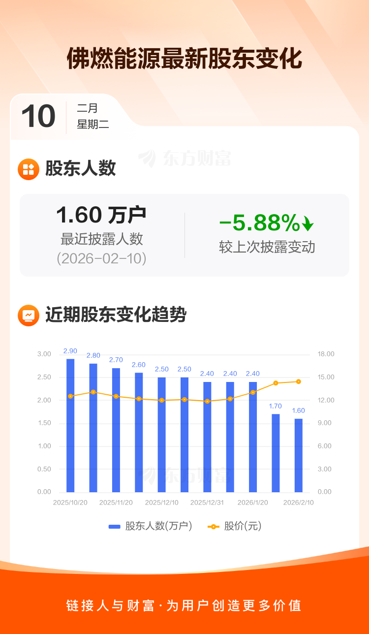 佛燃能源:截至2月10日最新股东户数1.60万户,较上期减少5.88%