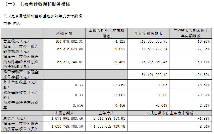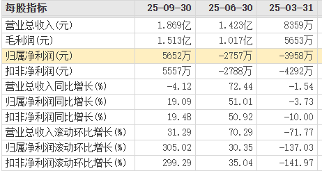 其中,第三季度实现营业收入1.87亿元,同比下降4.12%;归母净利润为5651.50万元,同比增长19.09%。