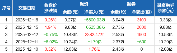 深南电路融资融券信息显示,2025年12月16日融资净偿还5600.03万元;融资余额9.27亿元,较前一日下降5.7%。