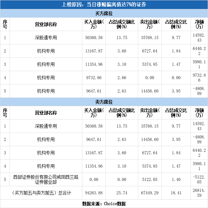 今日龙虎榜单上出现了深股通的身影,占据了买一、卖一的位置,净买入1.46亿元,占当日成交总额的3.98%,是获深股通净买额最高的个股。除此之外深股通还参与到了雪人集团、博纳影业、盛新锂能等12只个股中,其中6家呈现深股通净买入,获净买入最多的是盛新锂能,净买额为1.09亿元;6家呈现深股通净卖出,遭净卖出最高的为雪人集团,净卖额为1.43亿元。