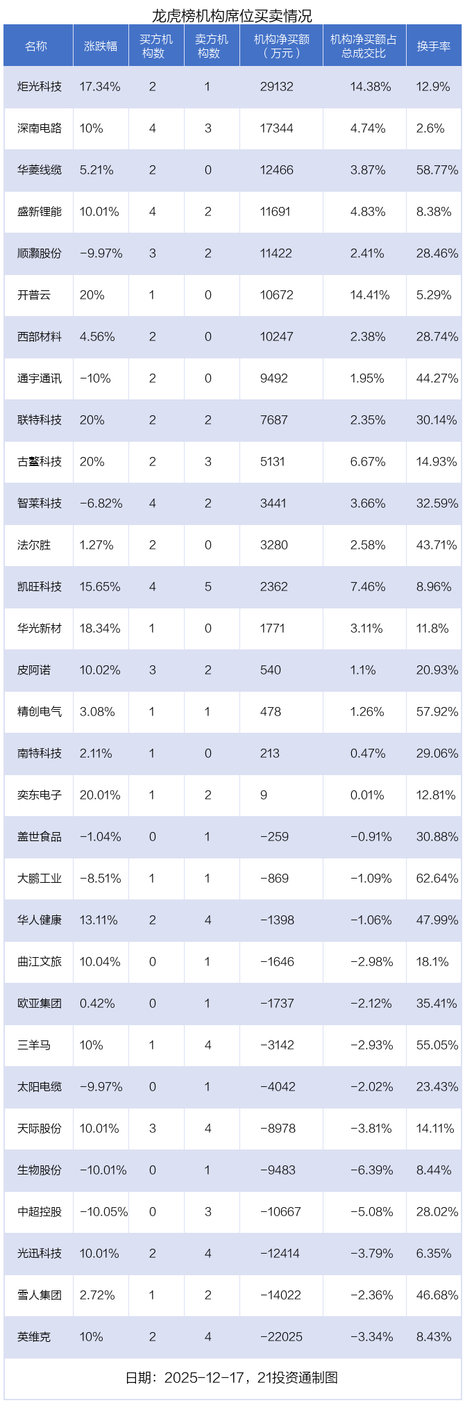12月17日,31只个股龙虎榜出现了机构的身影,机构合计净买入4.67亿元。具体来看,机构净买入18股,净卖出13股。
