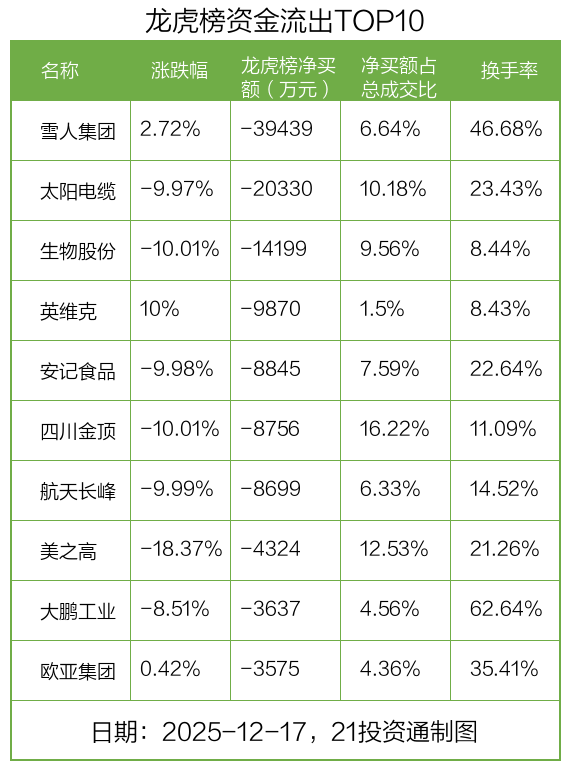 而龙虎榜中资金净流出最多的是雪人集团(002639.SZ),被净卖出为3.94亿元,占总成交金额的6.64%。雪人集团收盘上涨2.72%,换手率为46.68%。