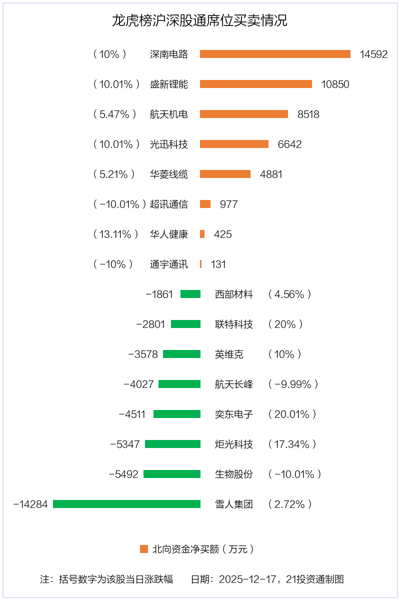 12月17日,北向资金参与龙虎榜中的个股共有16只,合计净买入5117.26万元。其中沪股通净买入2 股,净卖出3 股,合计净卖出5370.5万元;深股通净买入6 股,净卖出5 股,合计净买入1.05亿元。