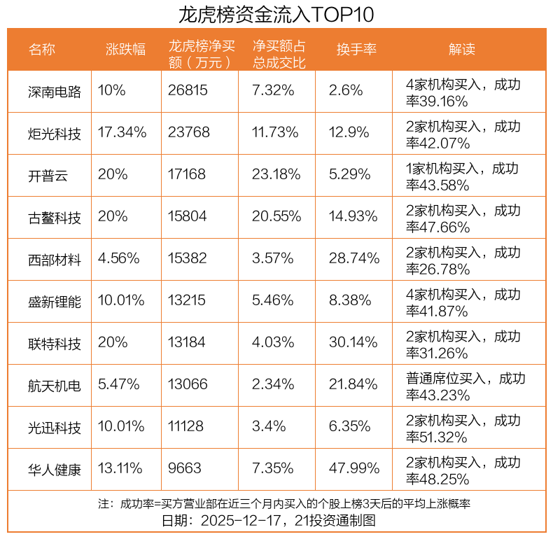12月17日,上证指数上涨1.19%,深证成指上涨2.4%,创业板指上涨3.39%。盘后龙虎榜数据显示,共有46只个股因当日异动登上龙虎榜,资金净流入最多的是深南电路(002916.SZ),达2.68亿元。