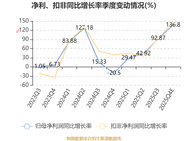 中证智能财讯深南电路(002916)1月27日晚间披露2025年度业绩预告,预计2025年归母净利润31.54亿元至33.42亿元,同比增长68%-78%;扣非净利润预计29.93亿元至31.67亿元,同比增长72%-82%;基本每股收益4.73元/股-5.01元/股。以1月27日收盘价计算,深南电路目前市盈率(TTM)约为50.66倍-53.68倍,市净率(LF)约10.46倍,市销率(TTM)约7.83倍。