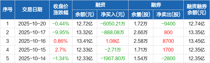 融资方面,当日融资买入1.29亿元,融资偿还1.89亿元,融资净偿还6050.21万元。融券方面,融券卖出700股,融券偿还1.01万股,融券余量1.72万股,融券余额214.09万元。融资融券余额合计12.74亿元。