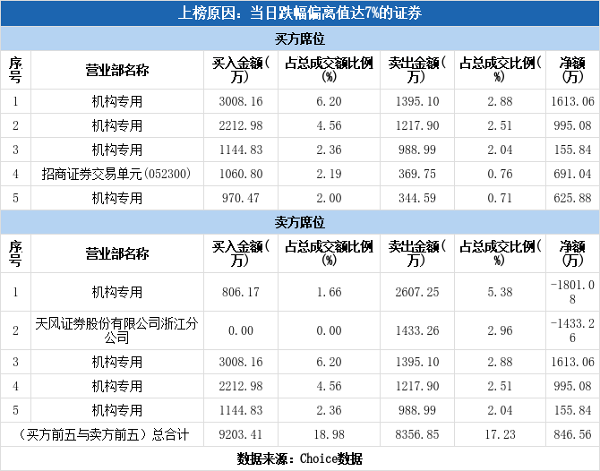 龙虎榜数据显示,今日共8个机构席位出现在龙虎榜单上,分别位列买一、买二、买三、买五、卖一、卖三、卖四、卖五,合计净买入1588.78万元,占龙虎榜净买额的187.67%。除此之外还有和而泰、航天发展、晓程科技等37只个股榜单上出现了机构的身影,其中19家呈现机构净买入,获净买入最多的是航天发展,净买额为2.36亿元;18家呈现机构净卖出,其中遭净卖出最高的为和而泰,净卖额为3.08亿元。