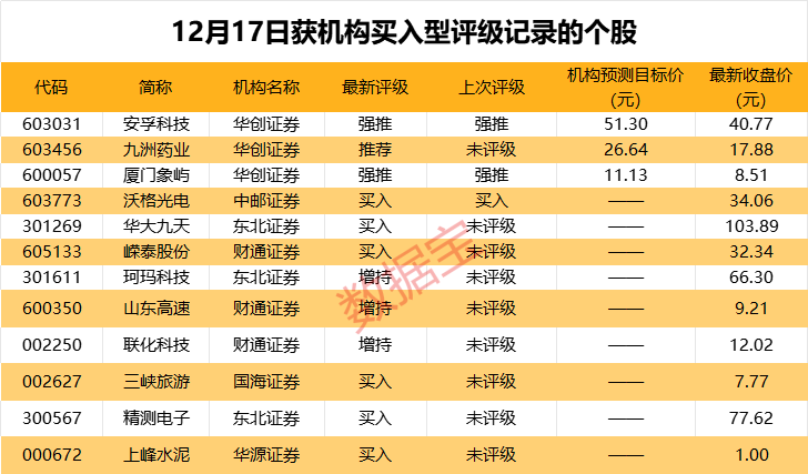据证券时报·数据宝统计,今日机构研报共发布12条买入型评级记录。其中,安孚科技、九洲药业、厦门象屿机构发布的预测目标价为51.3元/股、26.64元/股、11.13元/股,距离最新收盘价的上涨空间分别为25.83%、 48.99%、30.79%。