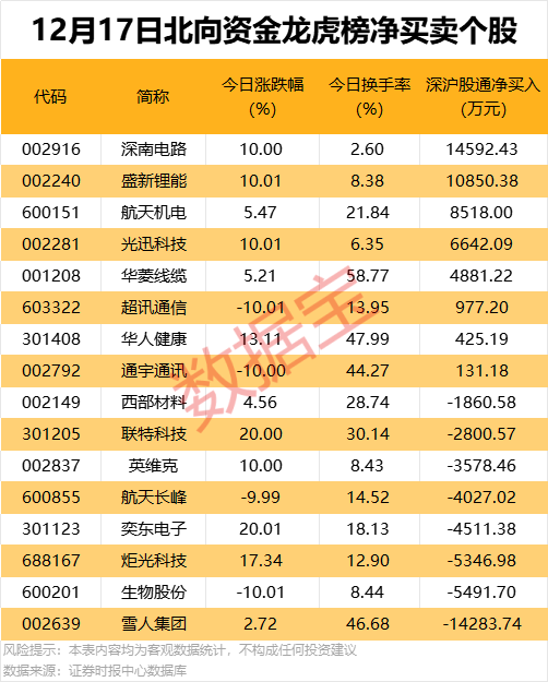 今日龙虎榜现身个股中,8股获北向资金净买入,其中深南电路获北向资金净买入1.46亿元,居首;盛新锂能获北向资金净买入1.09亿元。