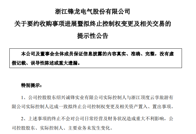 控制权转让连续推进了5个月后,锋龙股份发布公告,将此前包含股权转让、要约收购以及资产置入置出在内的一系列交易计划全部终止。对于终止原因,公司称主要系资产置入、资产置出的标的资产审计报告已经超过有效期限,相关事项可能无法在股份转让协议签署日起180日内完成加期审计并通过股东大会审议的情况,双方实际控制人达成一致,拟终止本次控制权转让及资产置入、置出事项。