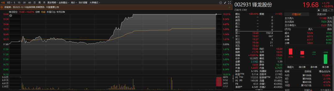 记者注意到,拟易主公告发布前,锋龙股份12月17日午间开盘后股价异动拉升成功涨停,全天成交2.33亿元,换手率6.18%。这种情况让投资者不禁疑惑:“聪明钱”是纯属巧合还是精准伏击?