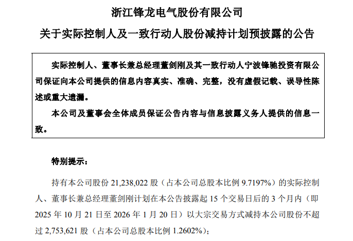 需要指出的是,在本次控制权变更事宜前,公司实控人董剑刚还抛出过减持计划。回顾来看,锋龙股份9月中旬公告,公司实际控制人、董事长兼总经理董剑刚及其一致行动人宁波锋驰投资有限公司计划在公告披露起15个交易日后的3个月内(即2025年10月21日至2026年1月20日)减持公司股份。